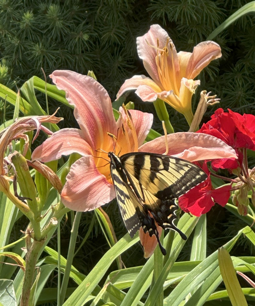 I wanted a garden to attract bees, hummingbirds and butterflies, so I started researching which plants are the best to attract them. The following plants are what we have as of today in the garden: 2 butterfly bushes, purple cone flowers, beebalm, black-eyed Susan’s, rosemary, spearmint, peppermint, honeysuckle, geraniums, marigolds, and day lillies. I placed small bee cups in the garden, so they won’t drown getting drinks of water. These are small ceramic flowers that hold about an ounce of water, for bees and other things to protect them. I learned about these the hard way, after I placed a large container water in the garden and lost several bees. We also, do not use any pesticides that would harm the wildlife. Now, every day in the garden we have Monarch butterflies, swallowtails, and many different types of bees.